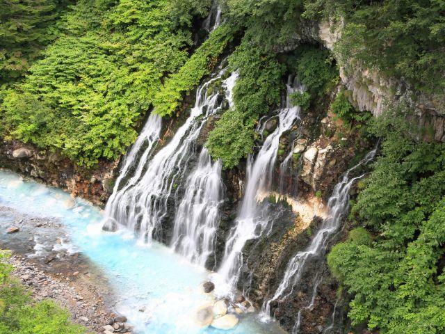 The Shirakane Falls in Furano, Hokkaido, has a drop of 30 meters and an altitude of 600 meters. It is located in the Shirogane Hot Spring Village of Biei Town. It is named "Shiratsu Falls" because of the white beard-like water pouring down from the cracks in the rocks. The water gushing from the ground beat against the rocks and stirred up blue waves. Here you can enjoy beautiful mountains and clear waters in summer and white snow in winter. You can enjoy the sharp contrast between the two seasons.